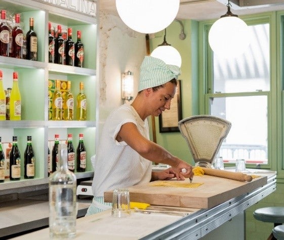 オープンシアター型のキッチンとパスタ工房を併設し、レストランではフレッシュパスタを軸としたメニューを。デリカテッセンでは、本場イタリアの食料品店さながら、生ハムからチーズ、パスタ工房で作る出来立てフレッシュパスタや手作りパニーニ、ドルチ、コーヒー、ワインなど、厳選した高品質のフードやスイーツが陳列棚に所狭しと並ぶ。