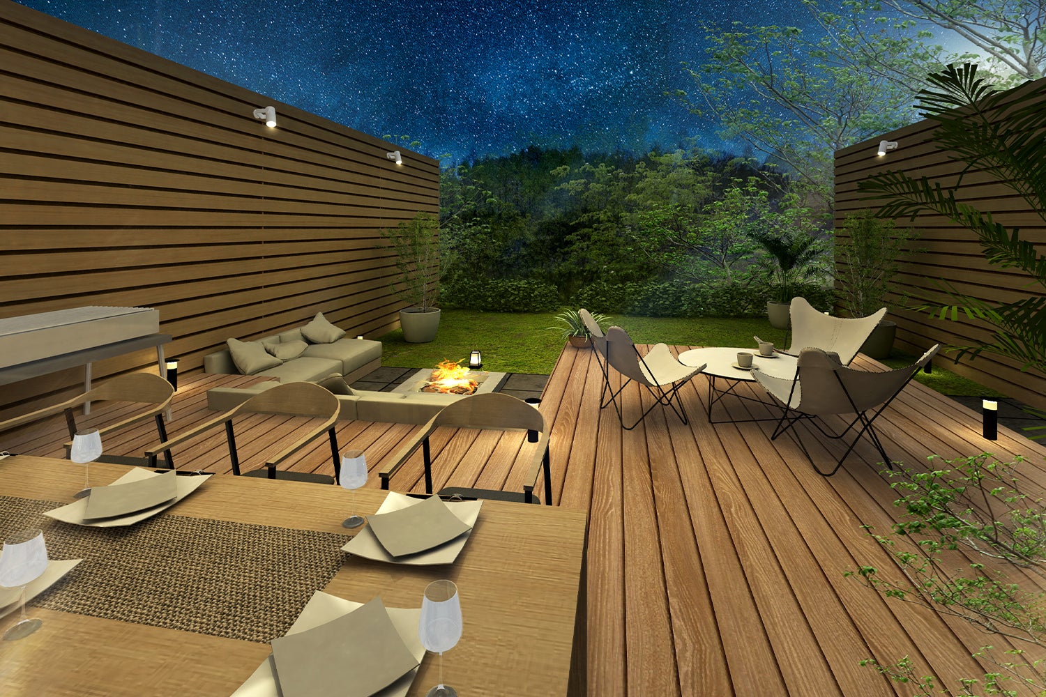 各室に焚火をはじめ、相州牛や清川恵水ポークに小田原港の海鮮を豪快にグリルしてBBQを楽しめるアウトドアリビングを完備。
