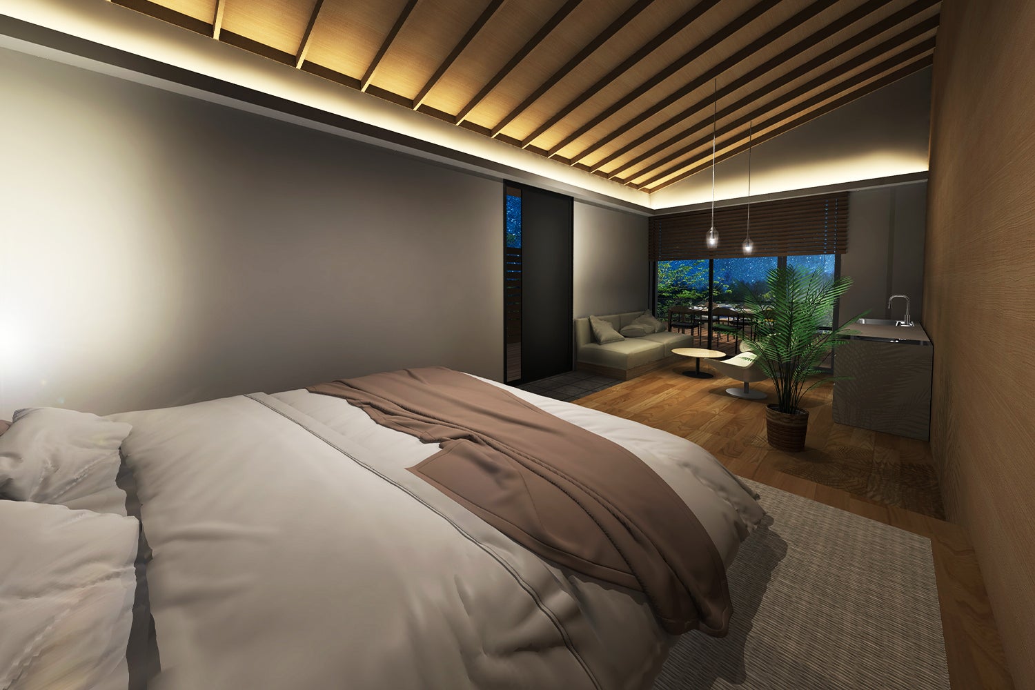 富士箱根伊豆国立公園内、静かな時間の流れる森の隠れ家は、全12室すべてに温泉風呂を完備したスイート仕様で、滞在ニーズに合わせて選べる5種類の部屋タイプを展開。うち2棟のみ愛犬同伴可能な客室を用意している。