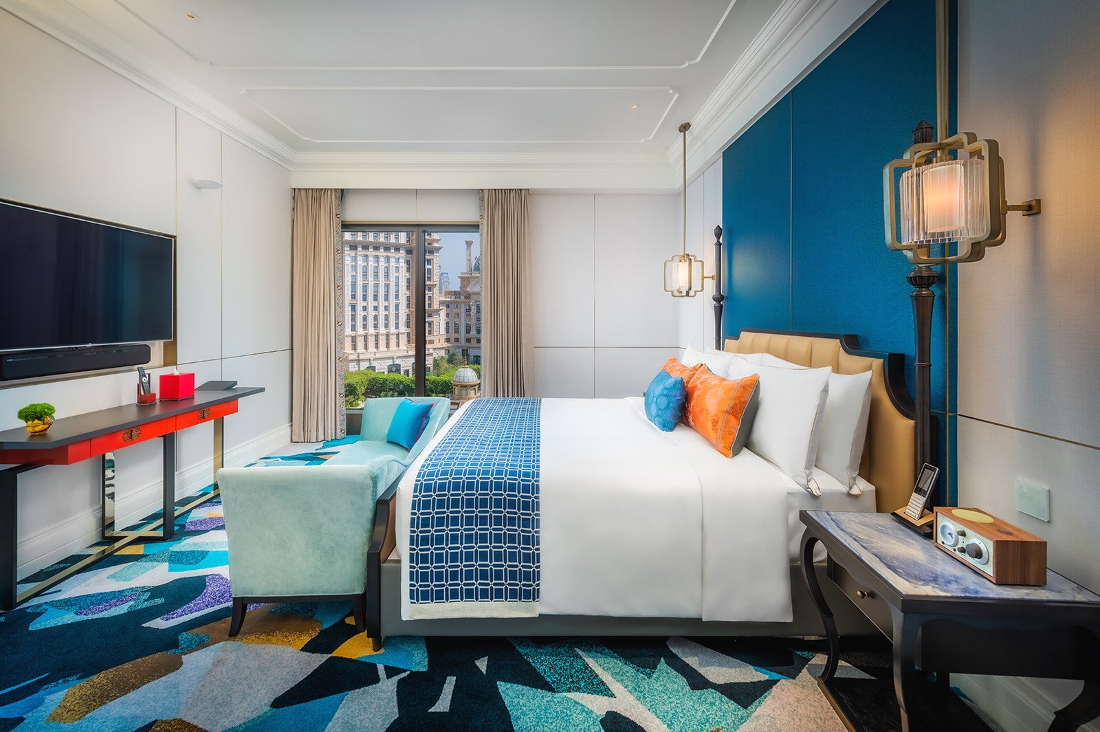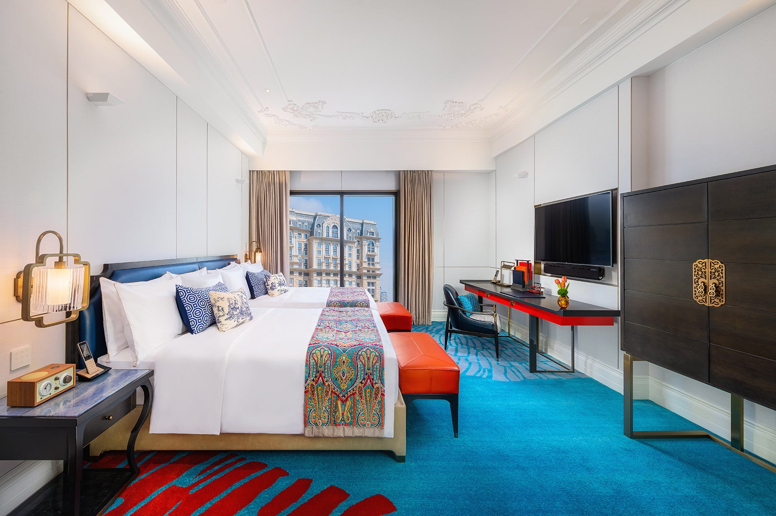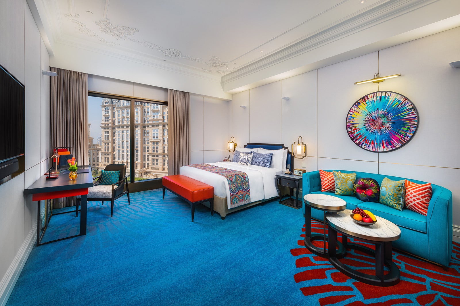 「グランド・リスボア・パレス・ホテル」のコンセプトは“東西文化の融合”。ヨーロッパのネオクラシックやベルエポック様式と中国文化のモチーフに加え、新旧マカオを表現したアートピースなどを展示。マカオの長年にわたる中国と西洋との交流が客室デザインにも反映されている。