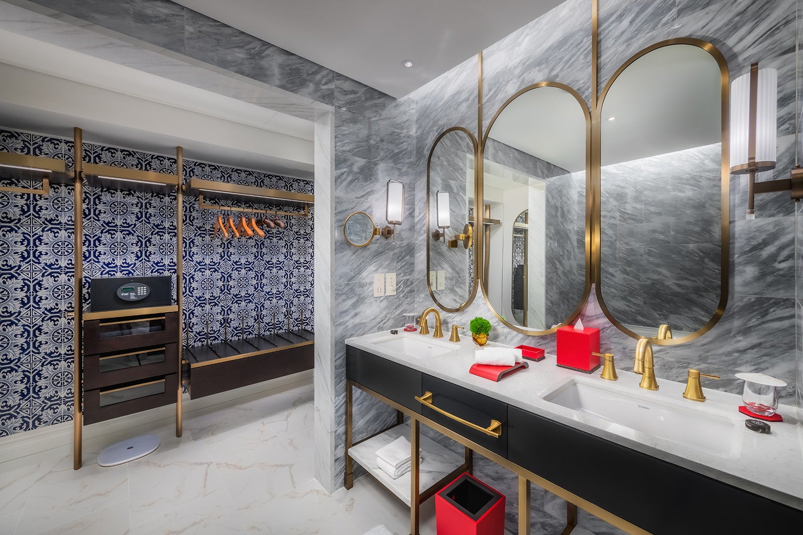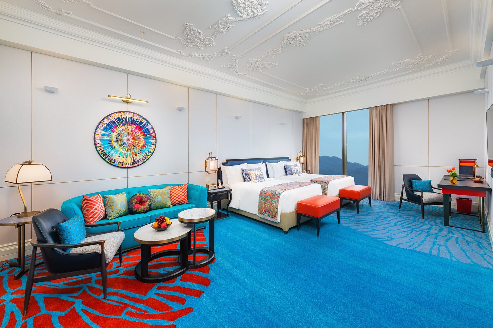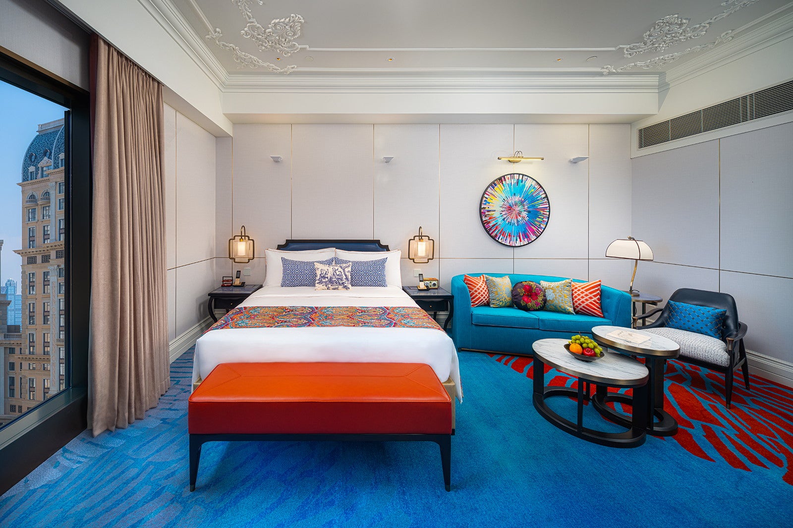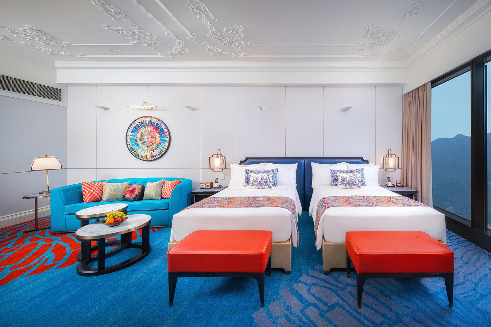 「グランド・リスボア・パレス・ホテル」のコンセプトは“東西文化の融合”。ヨーロッパのネオクラシックやベルエポック様式と中国文化のモチーフに加え、新旧マカオを表現したアートピースなどを展示。マカオの長年にわたる中国と西洋との交流が客室デザインにも反映されている。