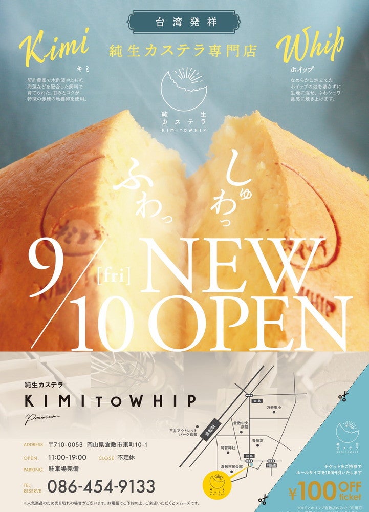 純生カステラ(台湾カステラ)専門店「KIMI TO WHIP premium(キミとホイッププレミアム)」が2021年9月10日(金)、岡山県倉敷市にオープンする。