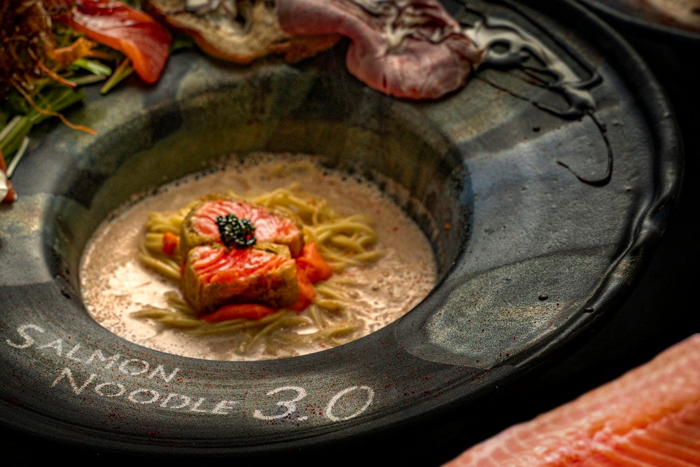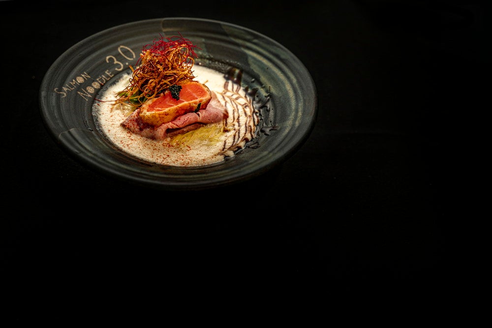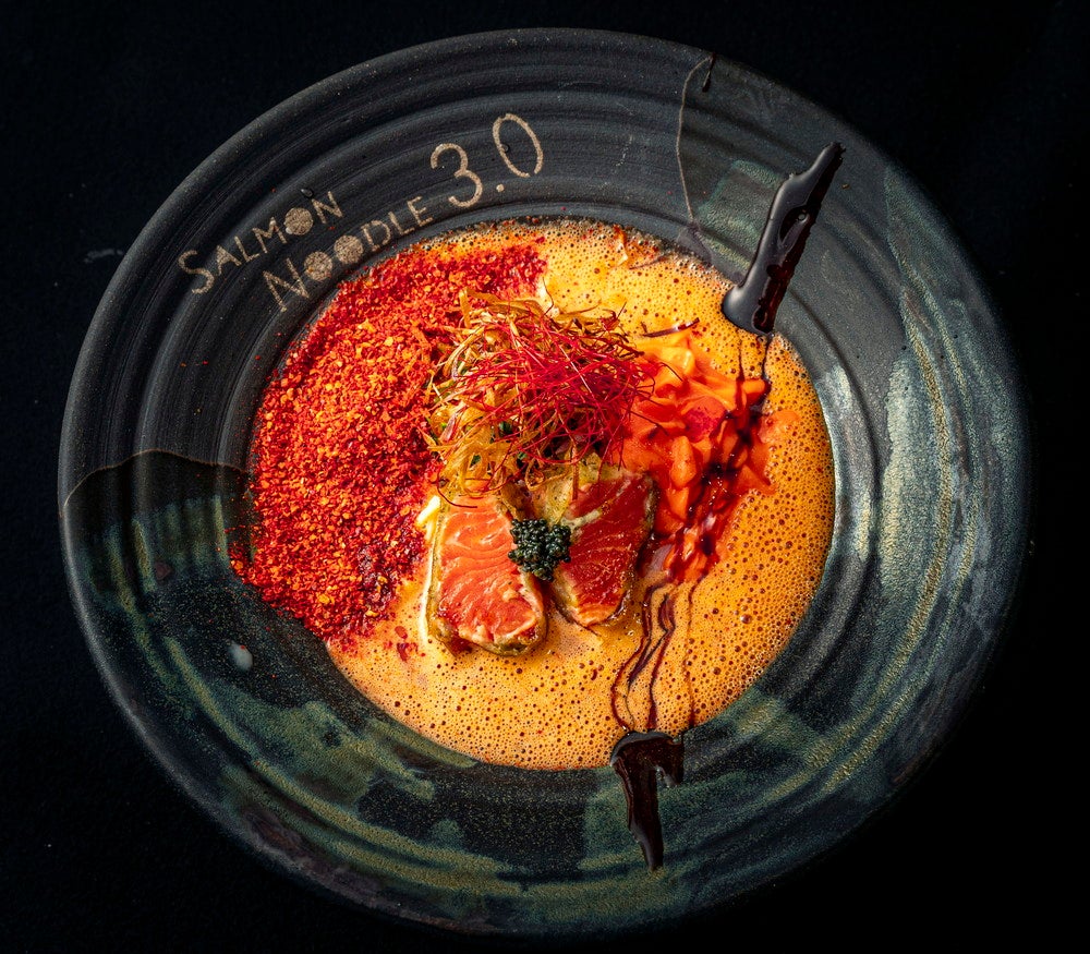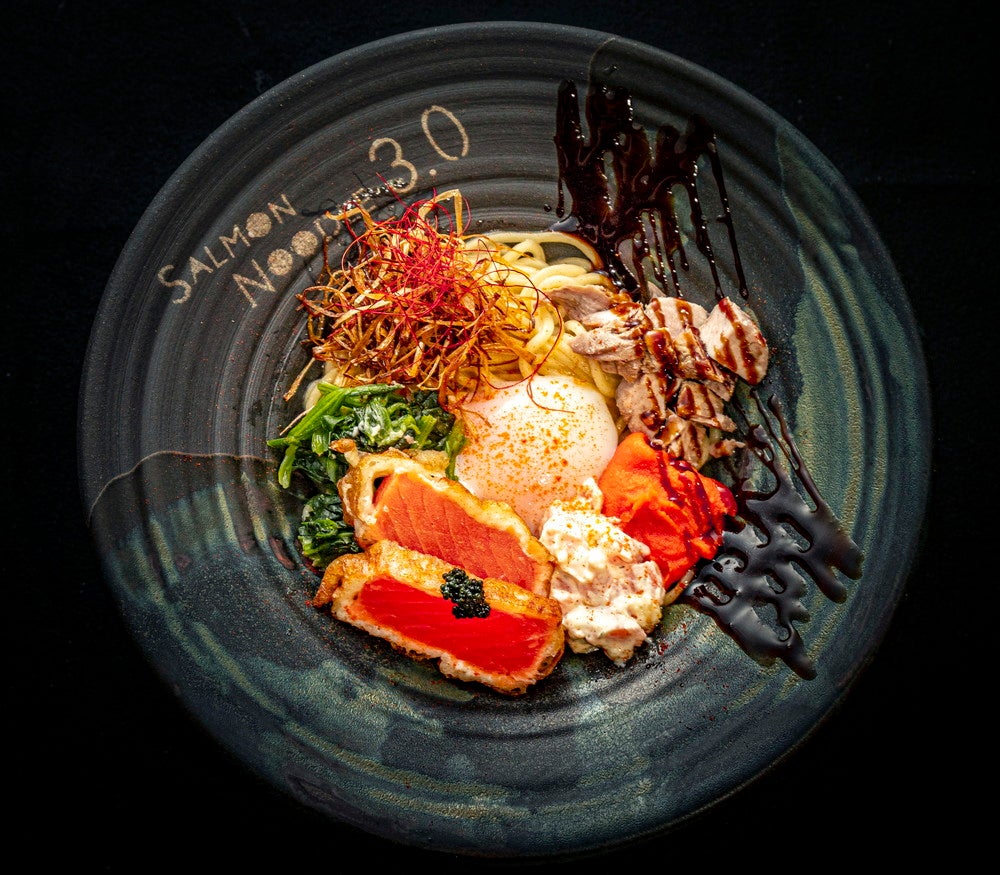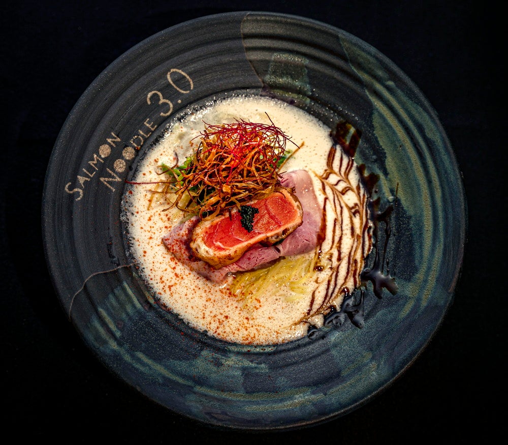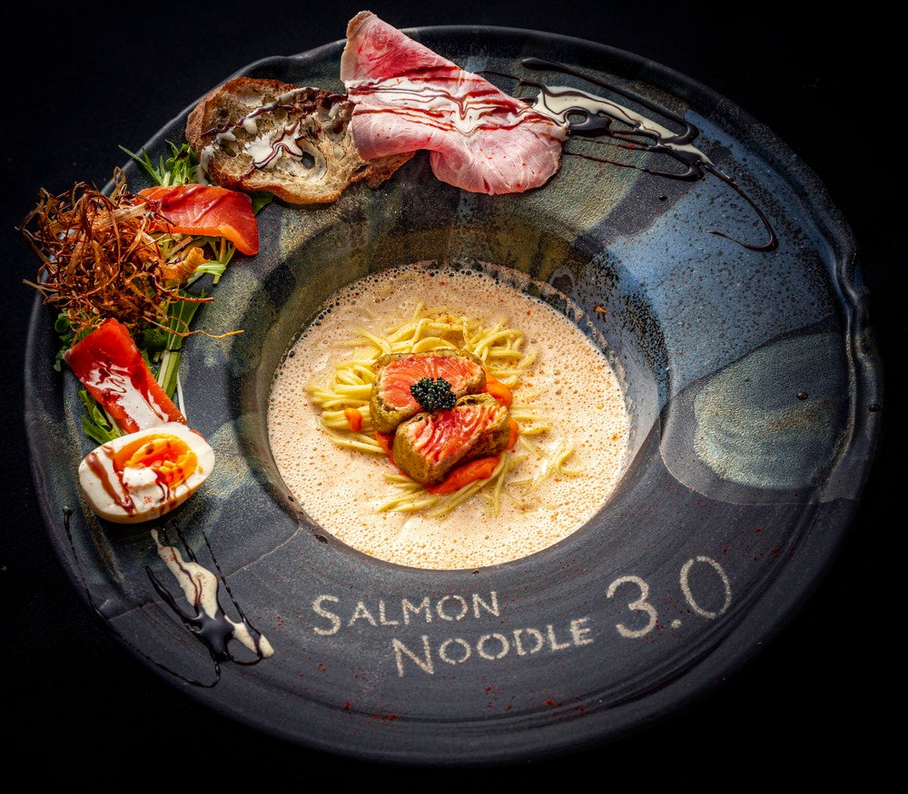 「サーモンnoodle3.0」は、サーモンを主役にフレンチの技術と最先端の分子調理を用いて、ここでしか味わえない各種サーモンラーメンを提供。