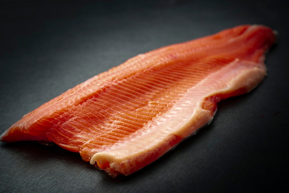 国内の林養魚場で水、餌環境からこだわって育てられた一級品サーモンを一本まるごと仕入れ、身の部分だけでなく内臓や皮など様々な部位をラーメンに使用。トッピングにもサーモンの身を贅沢に使用している。