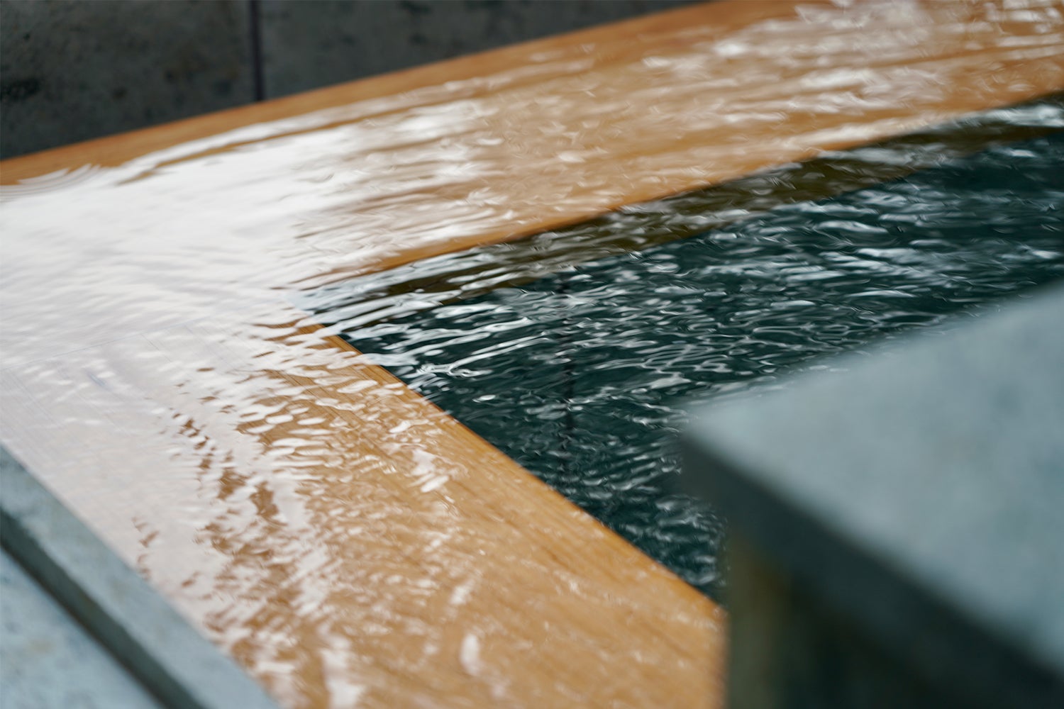 広々とした湯舟には、上質なブルーの色合いで、機能性も優れた希少な天然石「十和田石」を使用。優れた泉質の湯を、夜や朝はもちろん好きなタイミングで滞在中何度でも楽しめる。