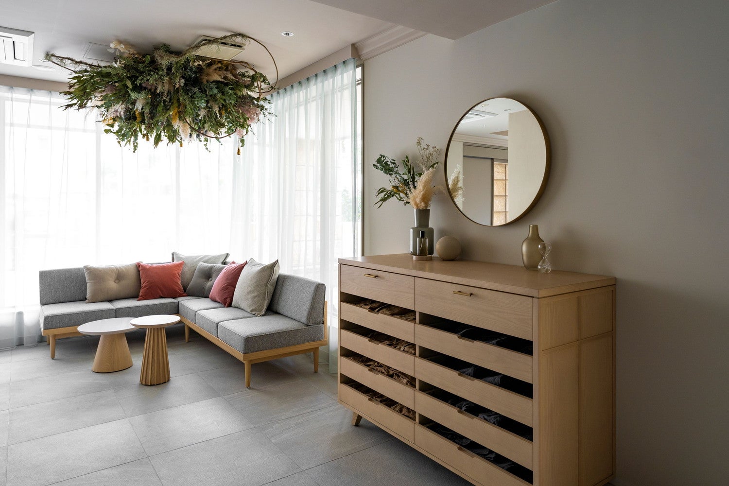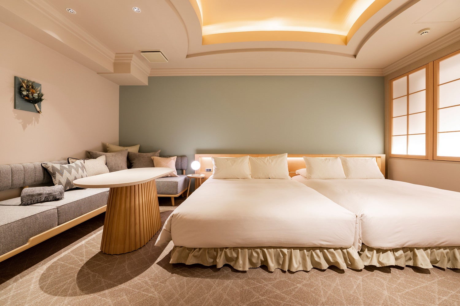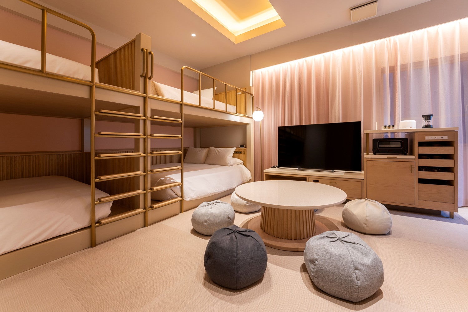 各客室とも33~52平米と全体的に広めに設計され、ダスティカラーを基調としたシンプルなデザインのプライベート空間に、オリジナル製作のダイニングテーブル、Bluetoothスピーカー、アロマディフューザーを設置。