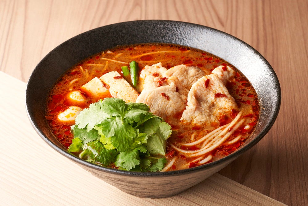 全てのスープのベースとなっている「清湯(クリアスープ)」、女性に人気の「番茄湯(トマト)」、焦がしスパイスの風味が際立つ「ウーラー」、酸味と辛みの絶妙なブレンドが食欲をそそる酸辣(サンラー)、酢の酸味とスパイスの辛味がマッチした「三哥酸辣(サムゴーサンラー)」から好みのスープを選べる。