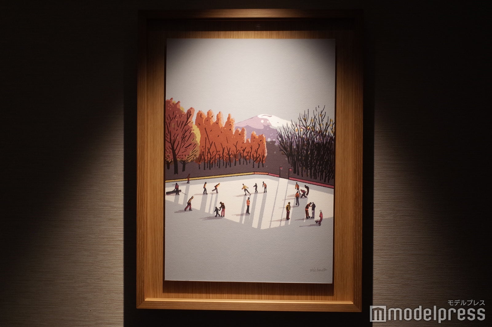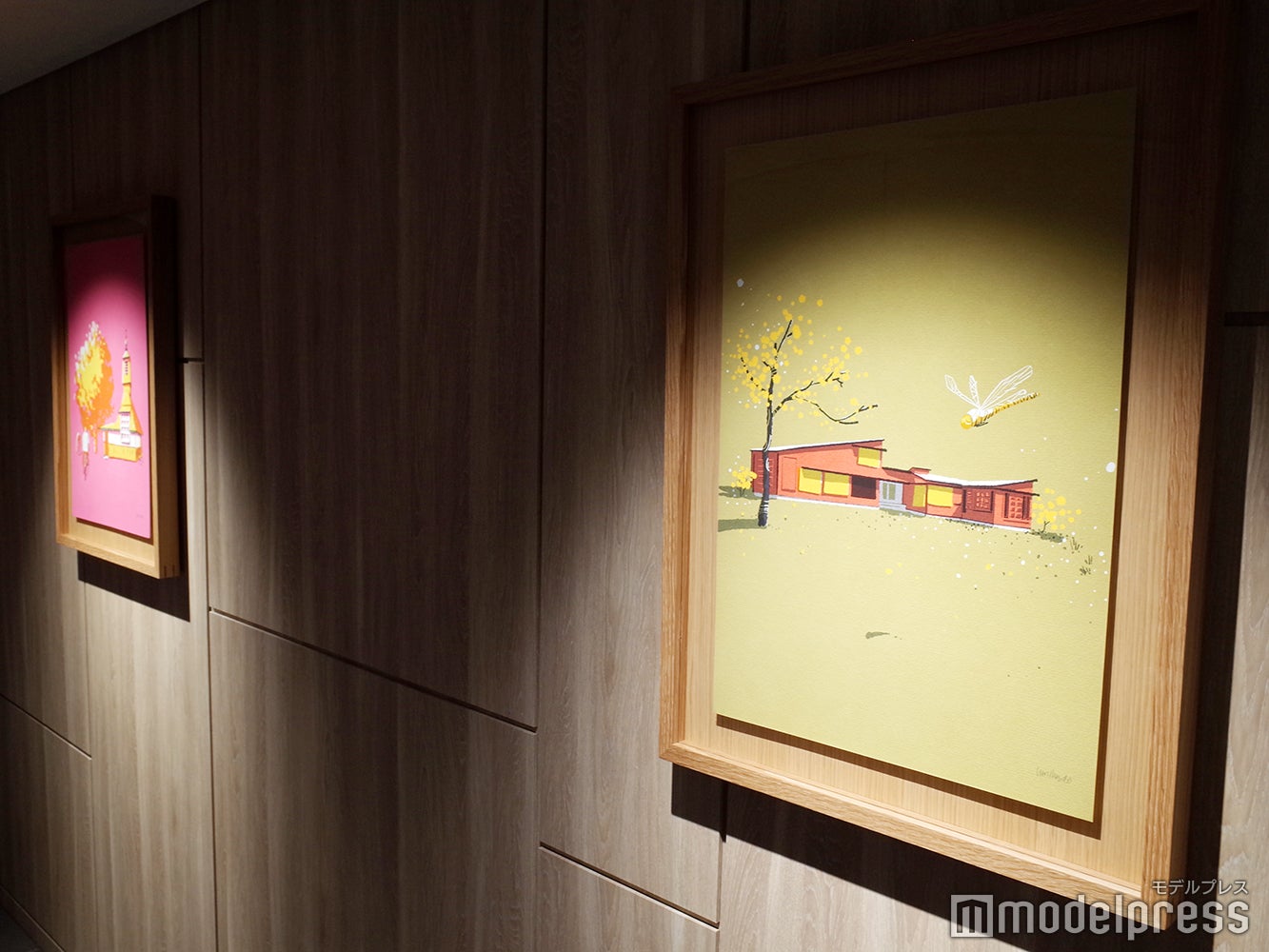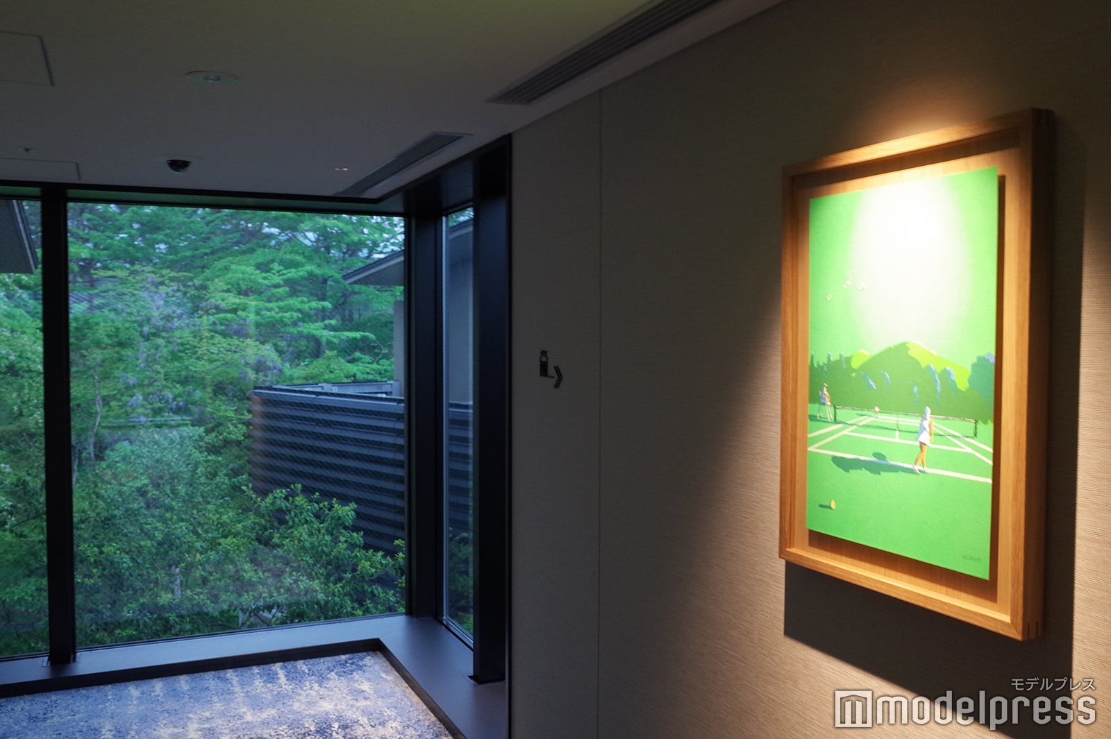 そのひとつが、客室棟の通路に飾られているスペイン出身のイラストレーター、ルイス・メンド氏によるアートワーク。ホテル全体が軽井沢らしい落ち着きのあるアースカラーのデザインであるのに対し、作品はポップでカラフルな色使いで描かれており、その色の対比もこだわりのポイントだそう。