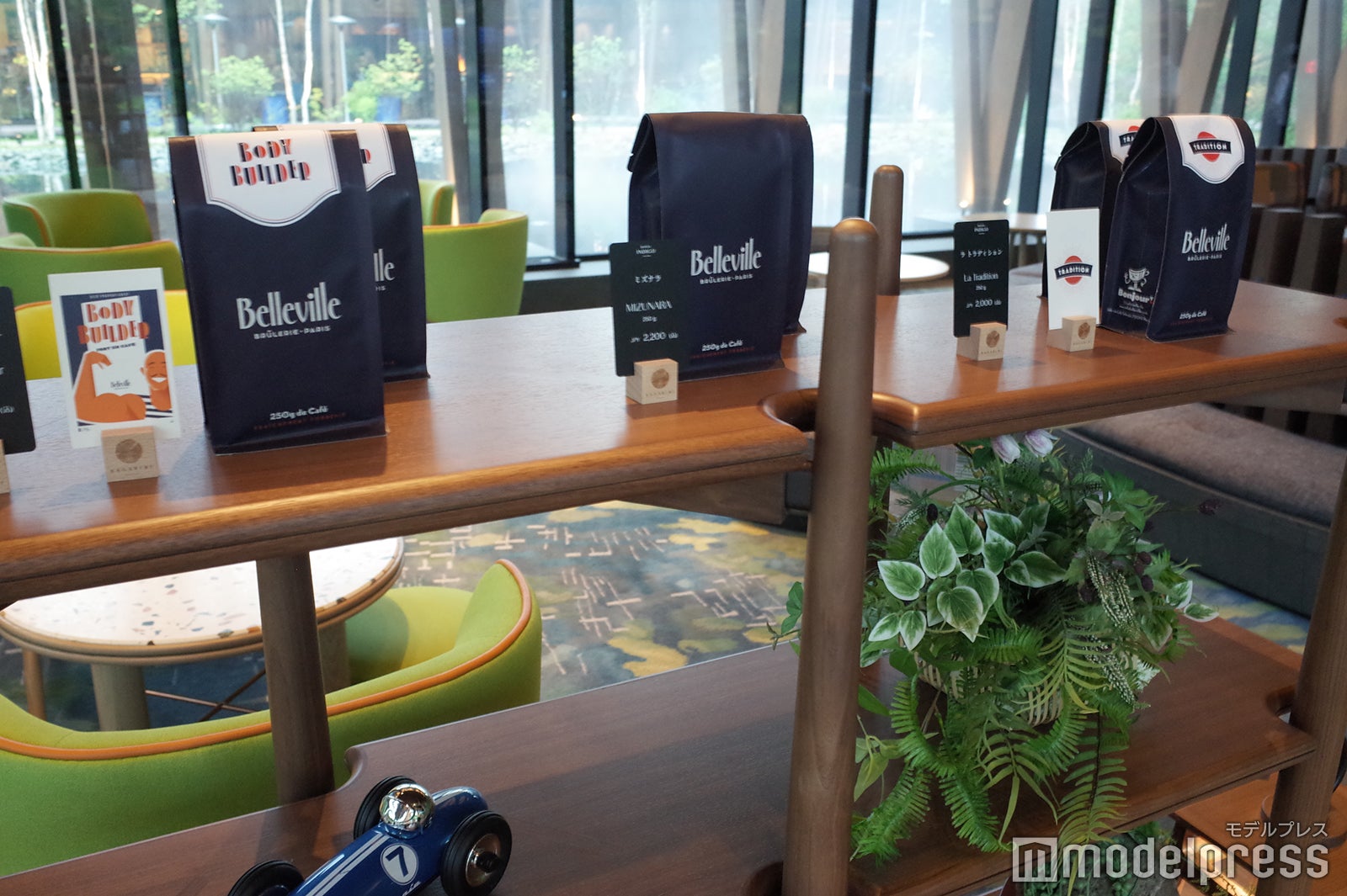 リフレッシュメントコーナーに飾られた浅間山をイメージした銅板と、軽井沢に生息する木製のリスをあしらったウォールアートも、軽井沢ならでは。無料のコーヒーや各種ティーバッグ、ミネラルウォーターも常備されています(※アルコールは有料)。