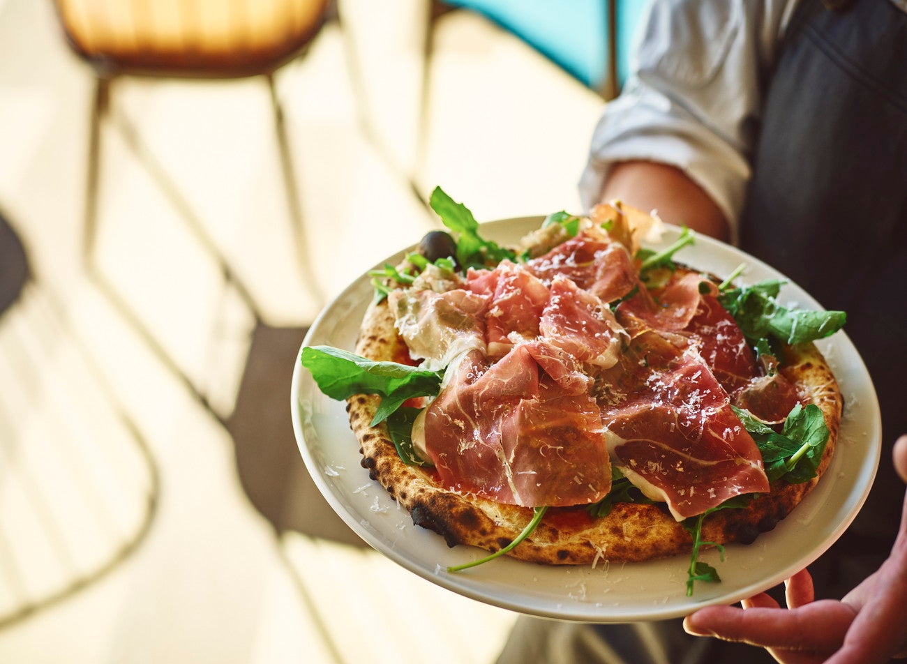 そしておすすめの逸品だという、緑と白の2種のアスパラガスの薪グリルもオーダー(※アスパラは6月まで、2022年7月以降夏メニューへ変更予定)。立派な太いアスパラに脂ののったグアンチャーレとチーズを散らし、底にしのばせたトマトケッカの酸味が味のアクセントに。