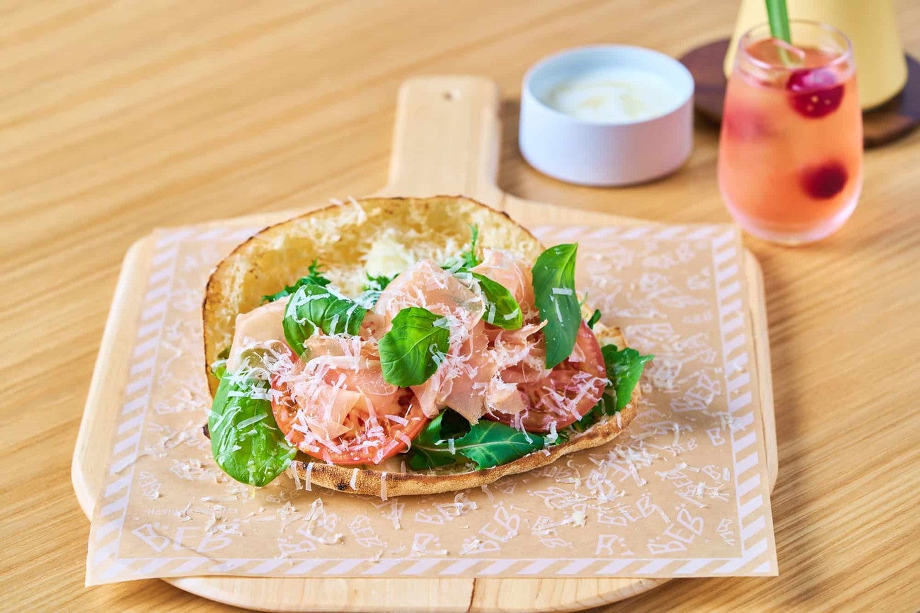 ピッツェリアをイメージしたカフェでは、朝食はピッツァ生地で作る生ハムサラダもしくはトロピカルフルーツのパニーノを、昼食と夕食には8種類のBEBピッツァを提供。