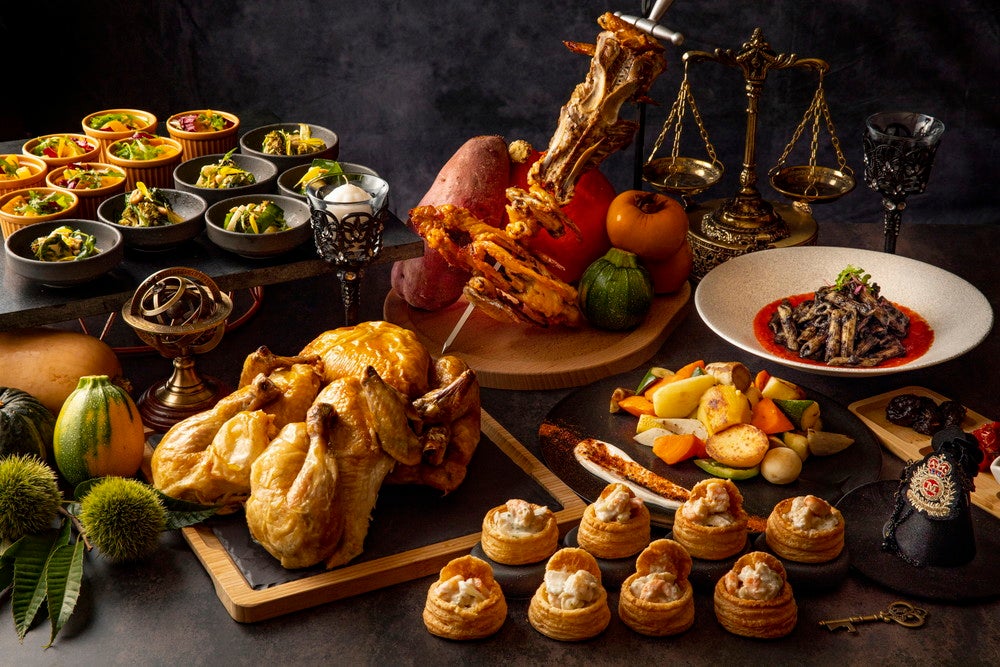 今回のビュッフェでは、ハロウィーンシーズンを盛り上げる魔法が詰まった20種類のマジカルスイーツに加え、シェフが目の前で切り分ける「ローストチキン ドライトマト・プルーンソース」や、下級生魔法使いが執事としてトレーサービスする海老クリームパイ「ヴォローヴァン」など10種類の食事を用意。