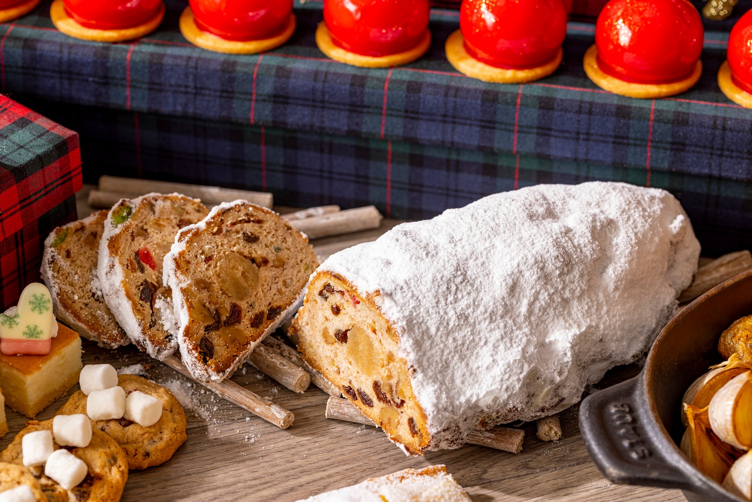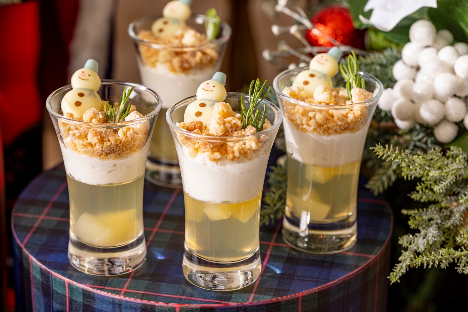 クリスマスに先駆け始まるスイーツビュッフェは、エレガントなタータンチェックのプレゼントボックスが溢れる空間に、クリスマスツリーやくるみ割り人形とともにフェスティブ気分を高めるスイーツやセイボリーをラインアップ。ホリデーシーズンにぴったりなビュッフェメニュー内容だ。