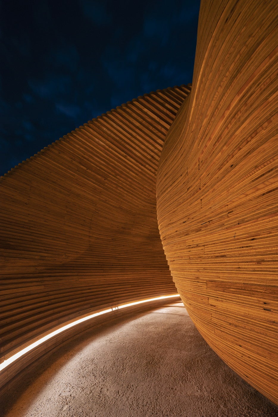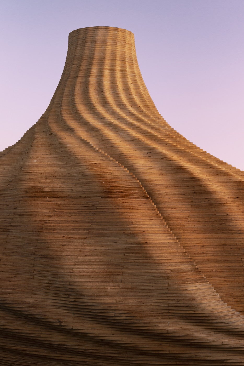 アートの島と呼ばれる直島らしい、作品となるような象徴的なサウナを作りたい、との思いからプロジェクトが始動。巻き貝を想起させる丸みのあるフォルムを構成するのは、緻密な計算の上で積み重ねた150段にもおよぶ細かいひだ状の木材。全体が美しく柔らかな曲線で型取られ、存在感がありながらも風景に溶け込むデザインが目を引くサウナが完成した。