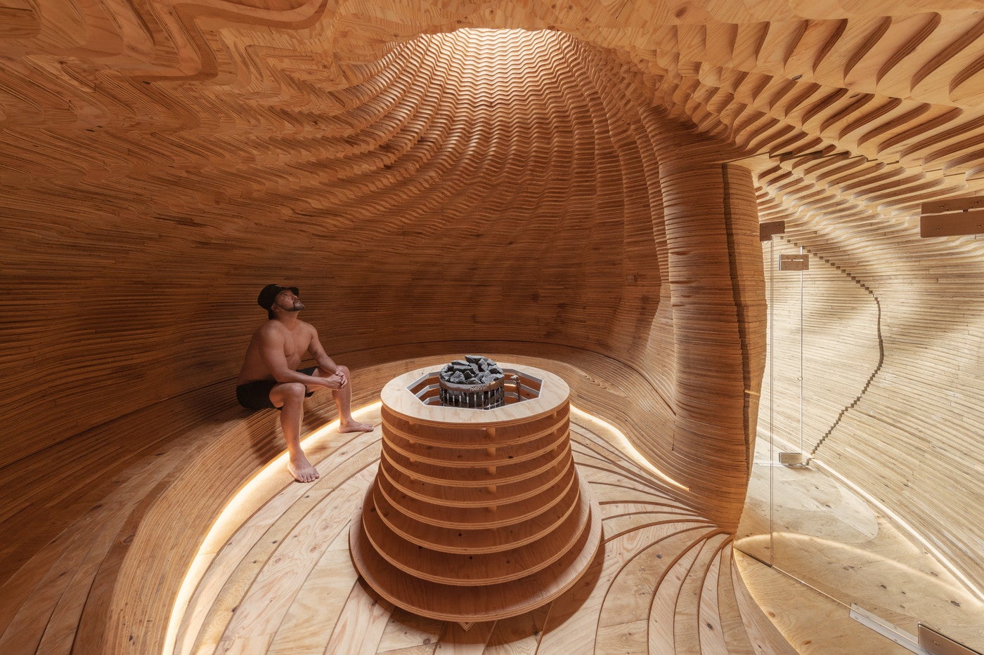 座面は背中がべたっとフィットするよう曲線で構成され、サウナストーブにはオートロウリュを完備。シャワー形状の水をストーブに吹き付け、定期的に自動でロウリュが施される仕様だ。