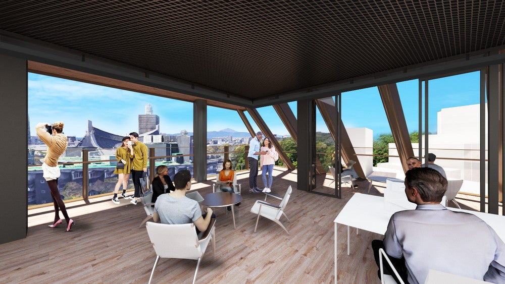 建築デザインはデュアリティ(二面性)をコンセプトに表参道側にはフラッグシップストアを誘致。高層棟の上層には開放的なテラスやルーフトップから明治神宮や代々木公園、表参道のケヤキ並木を望むことができる唯一無二の空間を整備する。