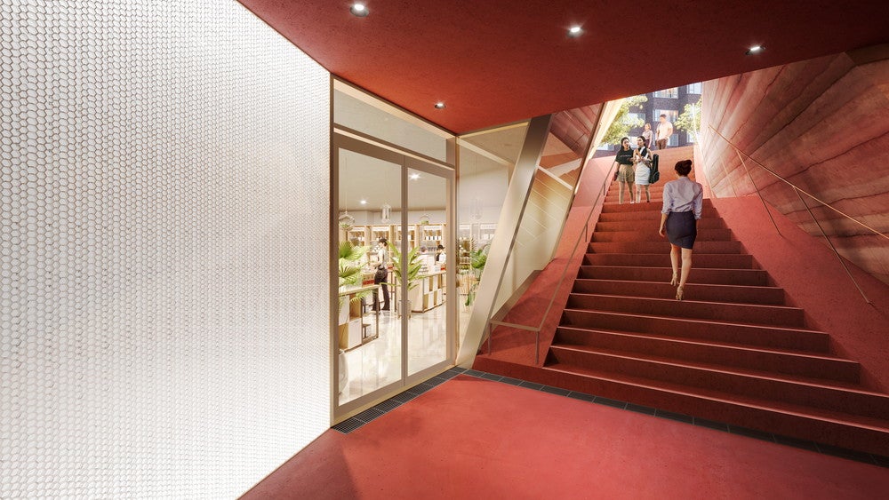 表参道側は垂直性と透明性を意識したアイコニックな外観とし、パサージュを抜けた先には、奥原宿のスケール感に合わせた小さな店舗や広場、アートスケープを配置。