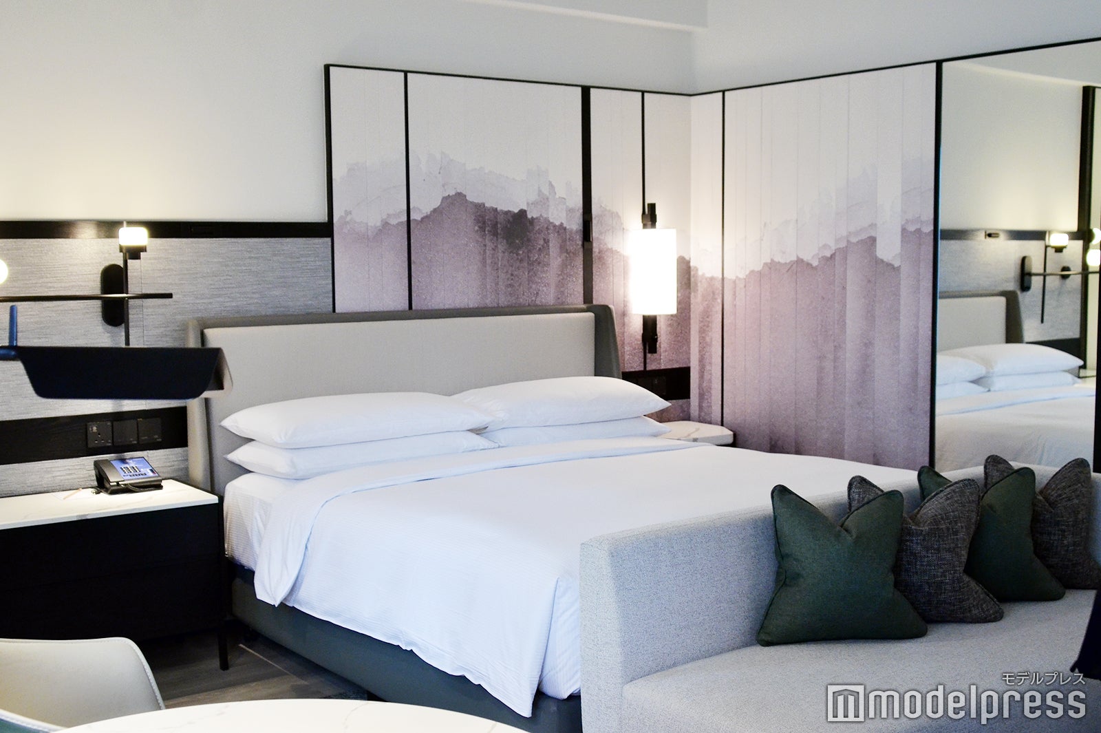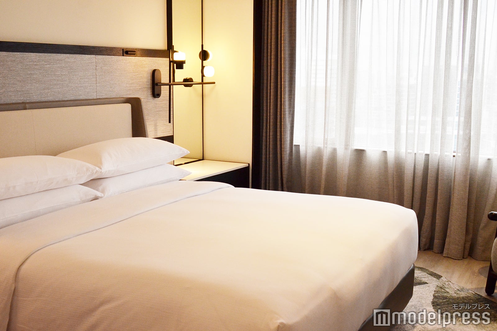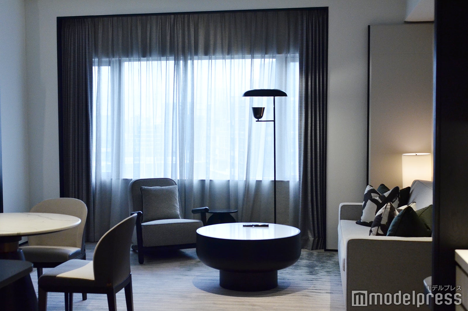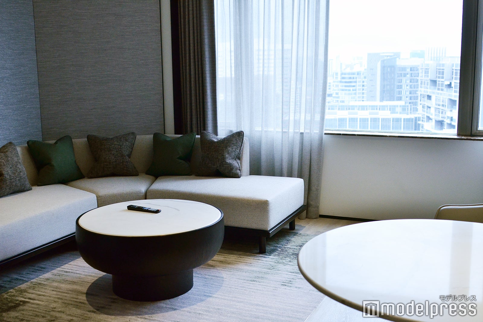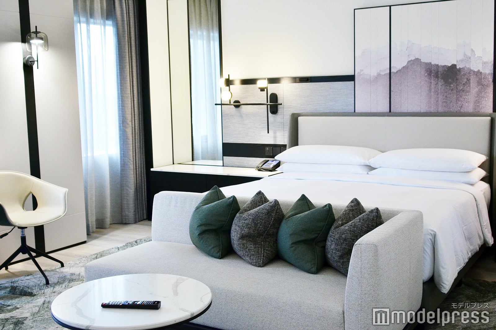 広さは29平米で、天井が高く大きな窓の向こうに高層ビル群が林立するアーバンリゾートらしい景色が広がります。窓際にファンクショナルな机とソファがありデザイン的にお部屋が広く感じられるよう設計されているそう。