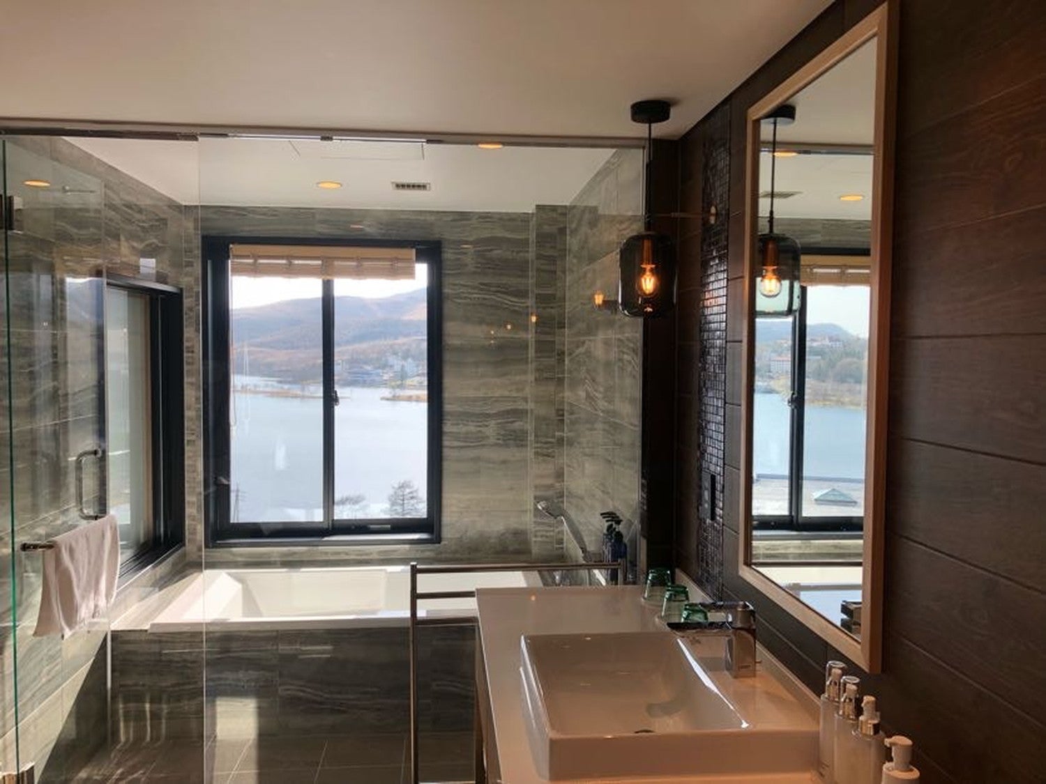 インフィニティ設計を採用した各エリアの露天風呂では、湖へ全身が溶け込んでいくような開放感とともに、高原の冷涼な風に包まれ、空気と一体化するような心地よさを味わえる。