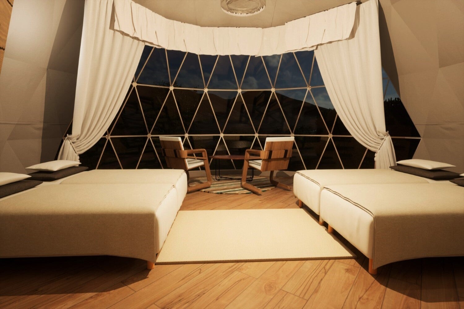 全棟空調、専用のバス・トイレ、独立洗面台を完備しており、スイートリバードームには温泉だけでなくプライベートテントサウナ付きと、快適に過ごせる環境が整っている。