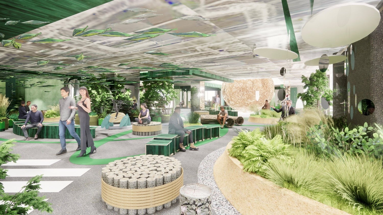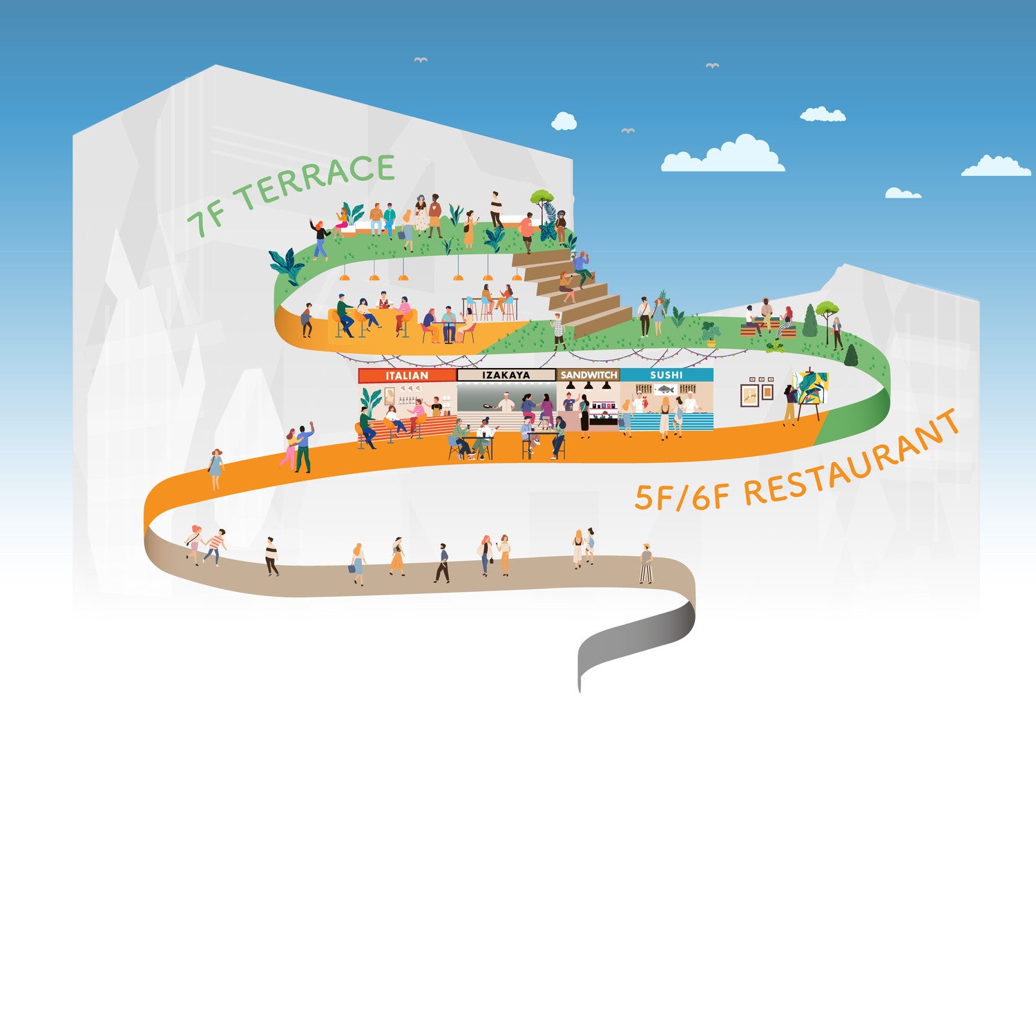 5階と6階は飲食フロアとなり、5階はクリエイティブマインドを刺激するような内装の店舗が横丁のように軒を連ね、アートも点在。6階は緑豊かな芝生ゾーンと開放的な屋上テラスとがシームレスにつながり、自分らしい時間の過ごし方を提供していく。